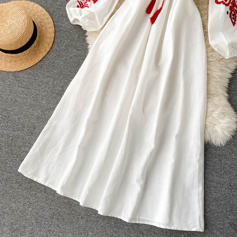 Step into timeless beauty with this bohemian embroidered dress, featuring delicate red and blue stitching that enhances its elegant folk-inspired appeal. The flowy silhouette, soft fabric, and puffy long sleeves create a romantic, effortless aesthetic, perfect for vacations, brunch outings, or relaxed summer styling. Whether paired with ankle boots for a rustic touch or strappy sandals for a breezy feel, this dress exudes sophistication with an artisanal edge.