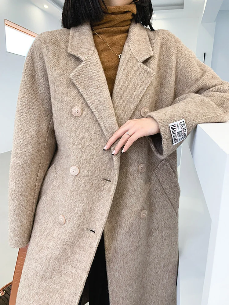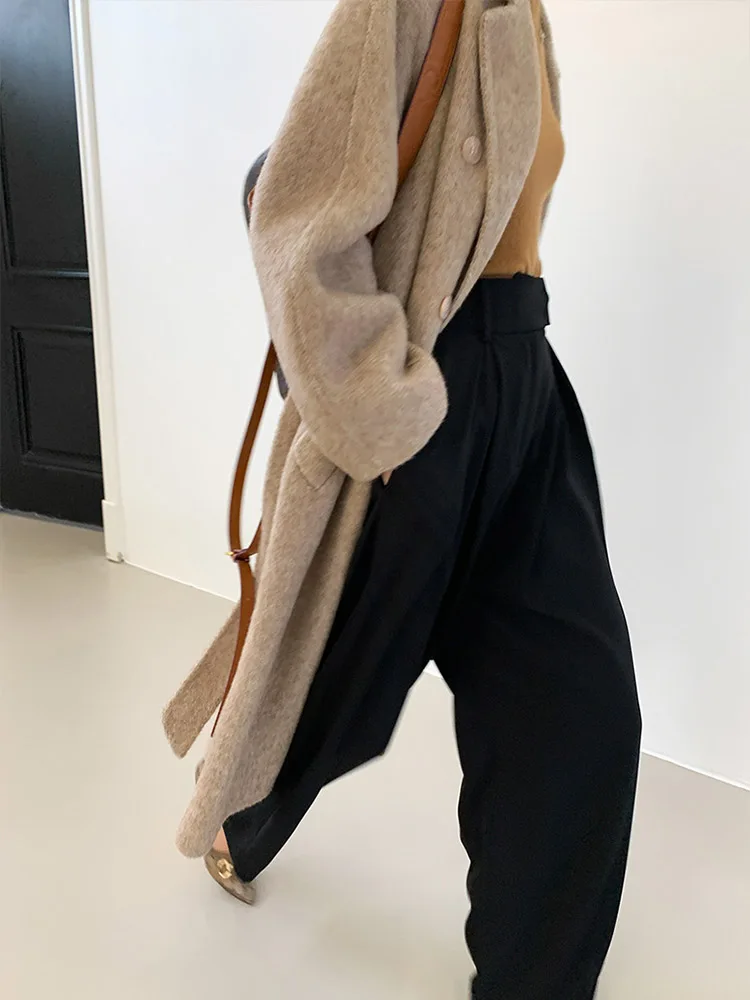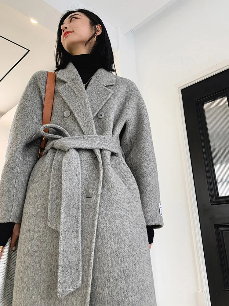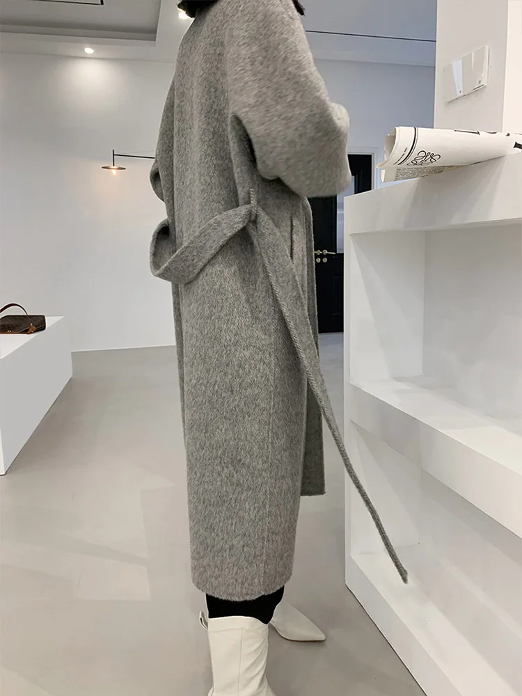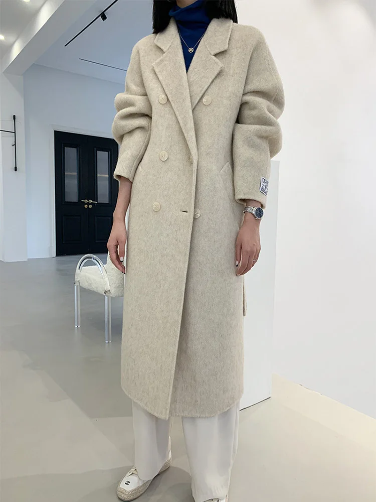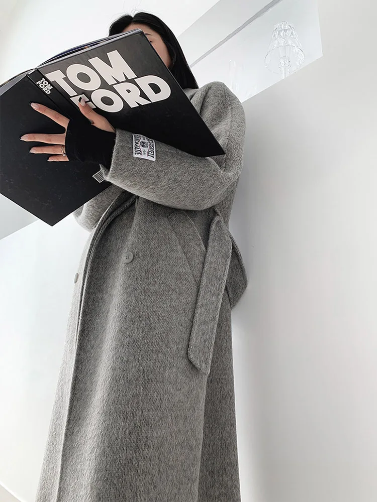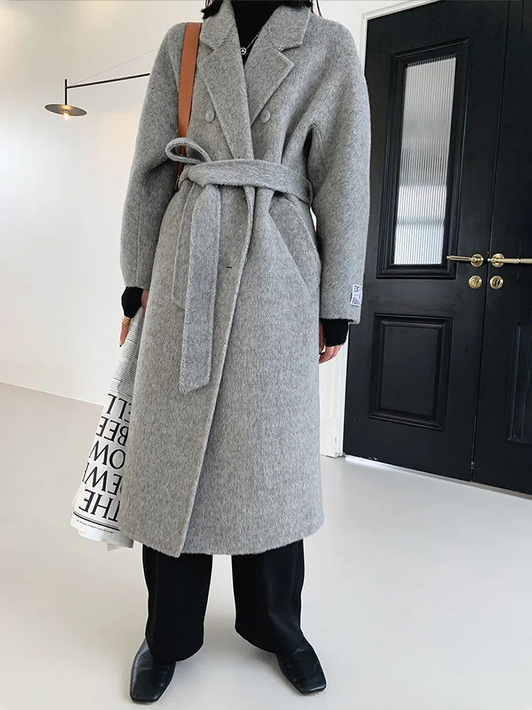 Double-Breasted Woolen Belted Coat – Elegant Long Winter Overcoat for Effortless Style