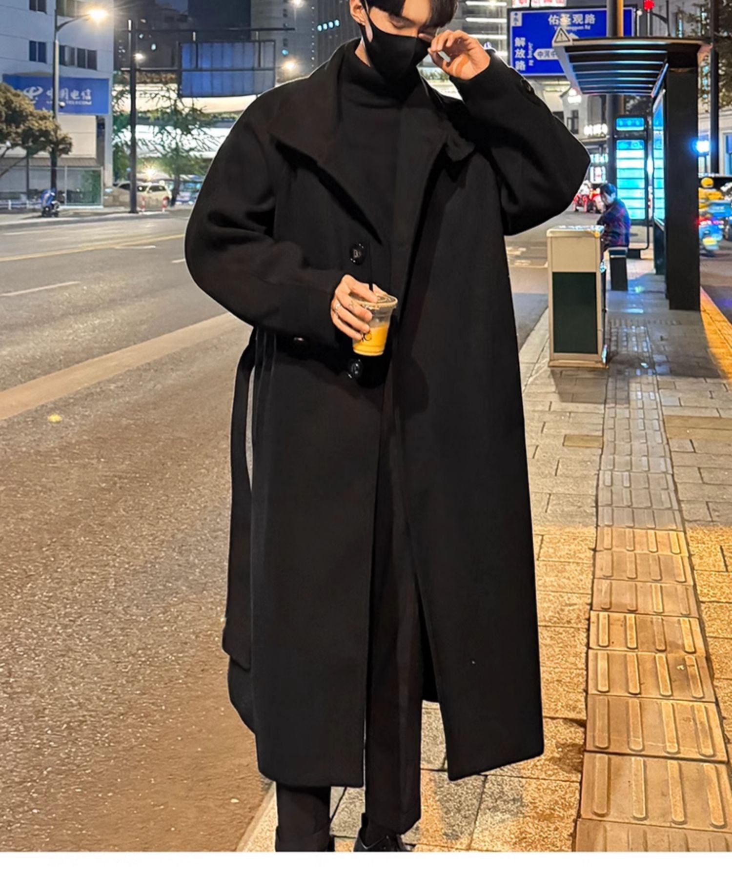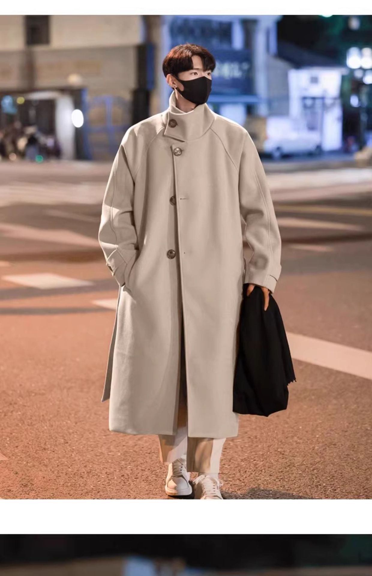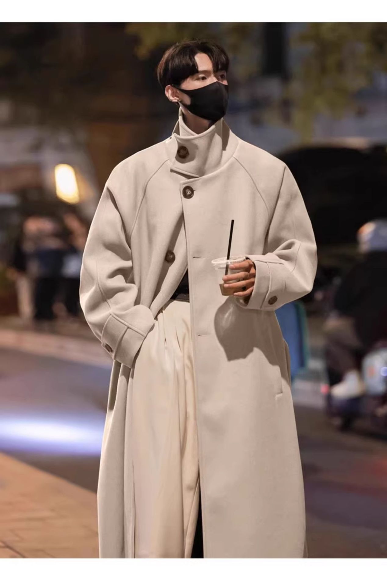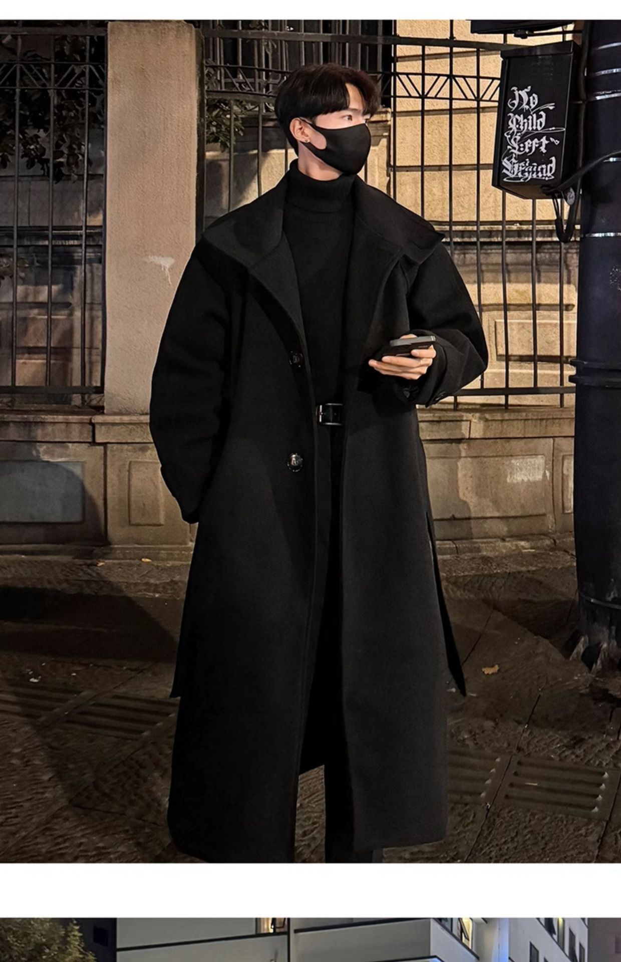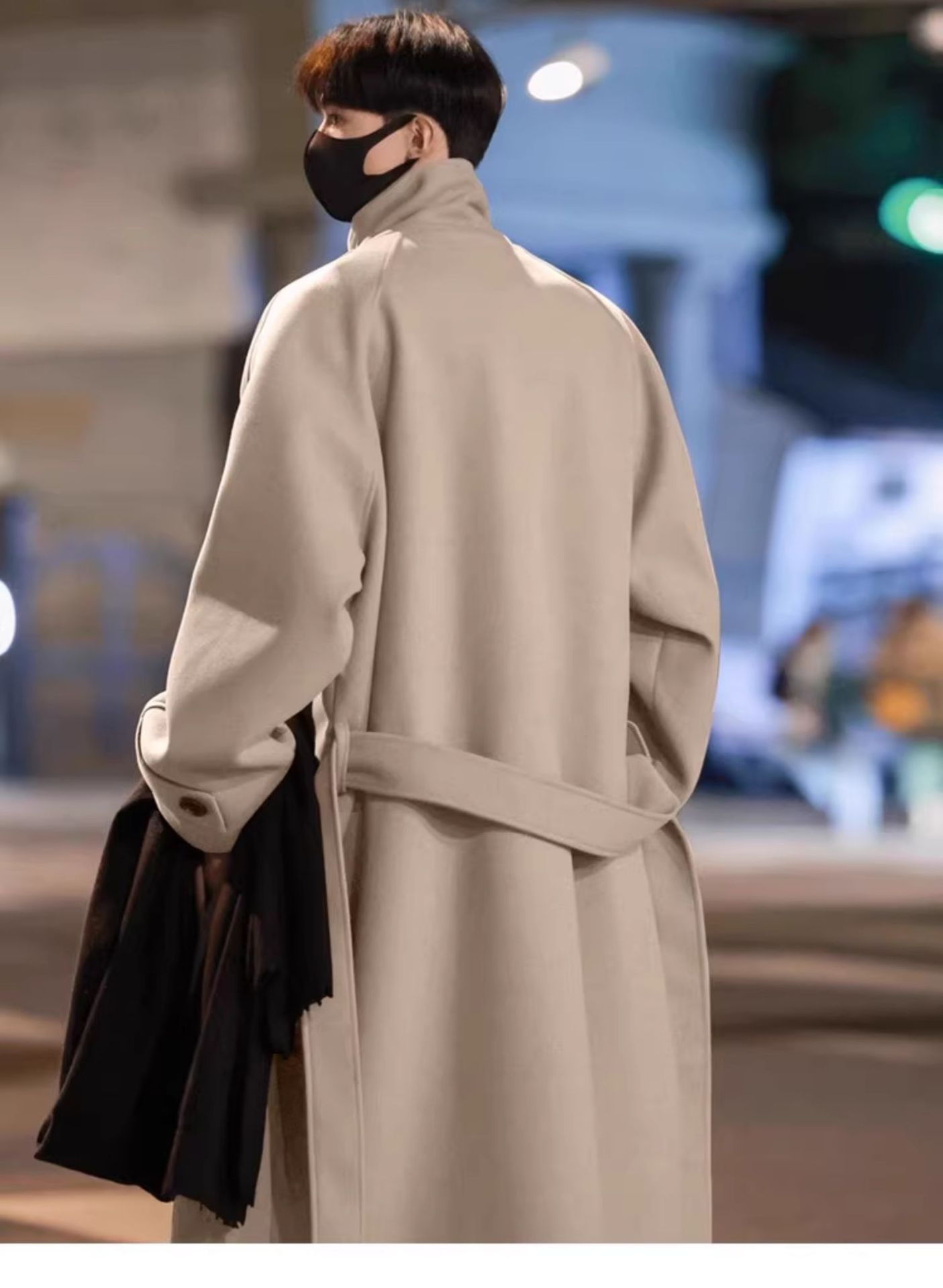Men’s Maillard Over-the-Knee Wool Coat, Winter Thickened Tailored Long Coat, Korean Streetwear Style